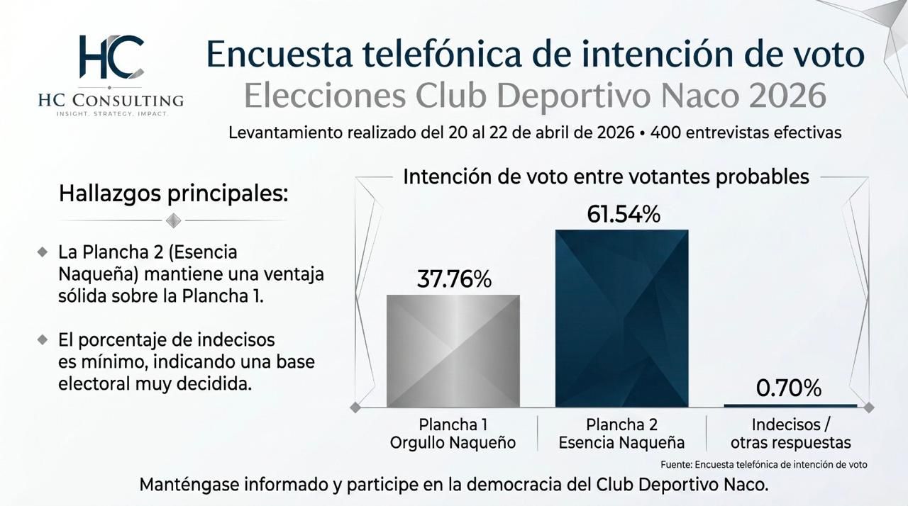 La medición refleja un escenario de alta expectativa entre los socios del emblemático club, en medio del dinamismo y el interés que suele generar la elección de su junta directiva. Según los resultados del estudio, la propuesta de Esencia Naqueña aparece como favorita para alzarse con la victoria en este certamen cívico e institucional.