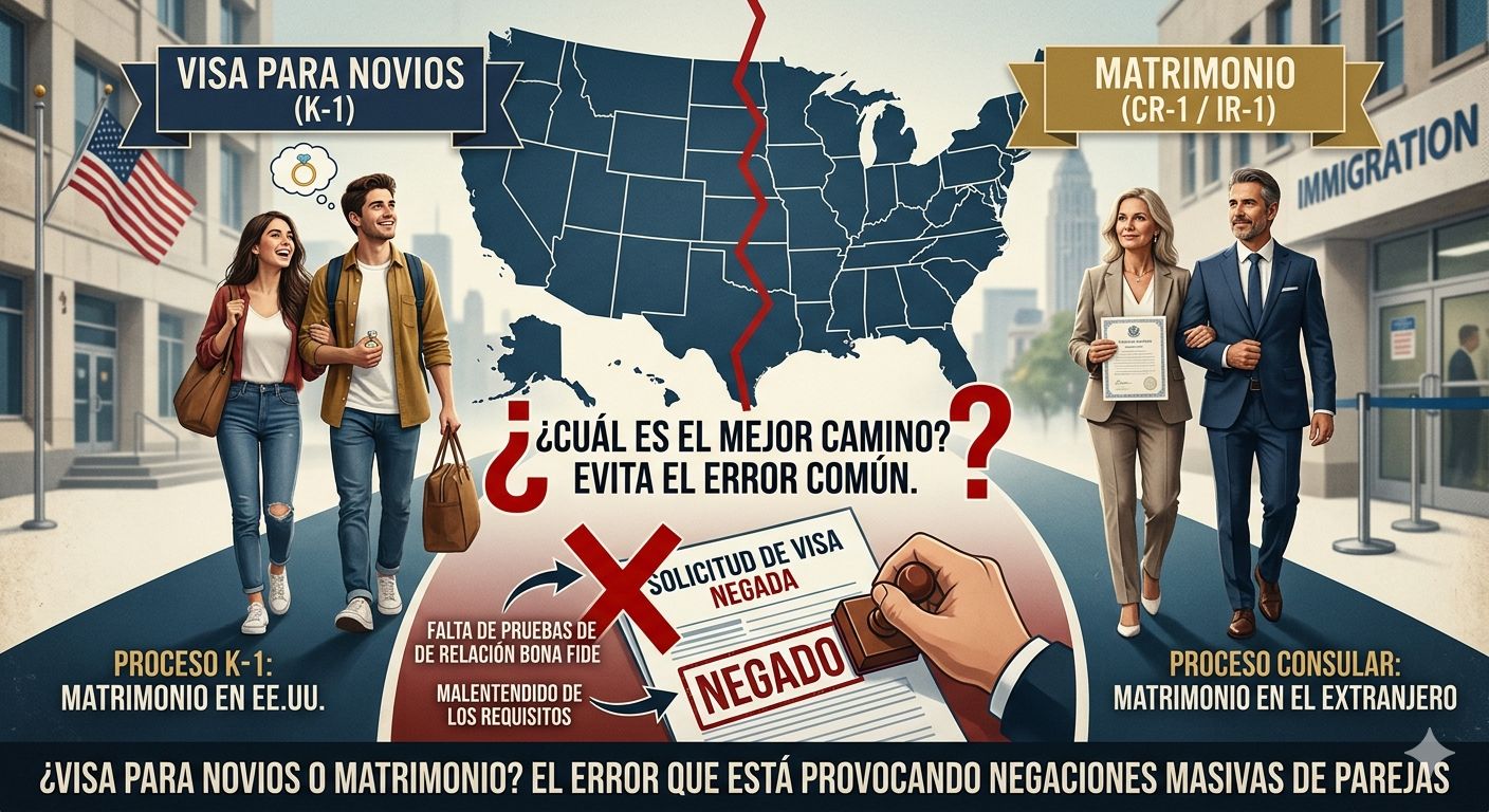 El error más común es tomar la decisión por emoción: “Quiero casarme allá porque es más bonito” o “Quiero traerlo rápido sin pensar en el proceso completo”. Esto es lo que termina en negaciones. La diferencia entre aprobación y negación no es el amor… es la estrategia migratoria.